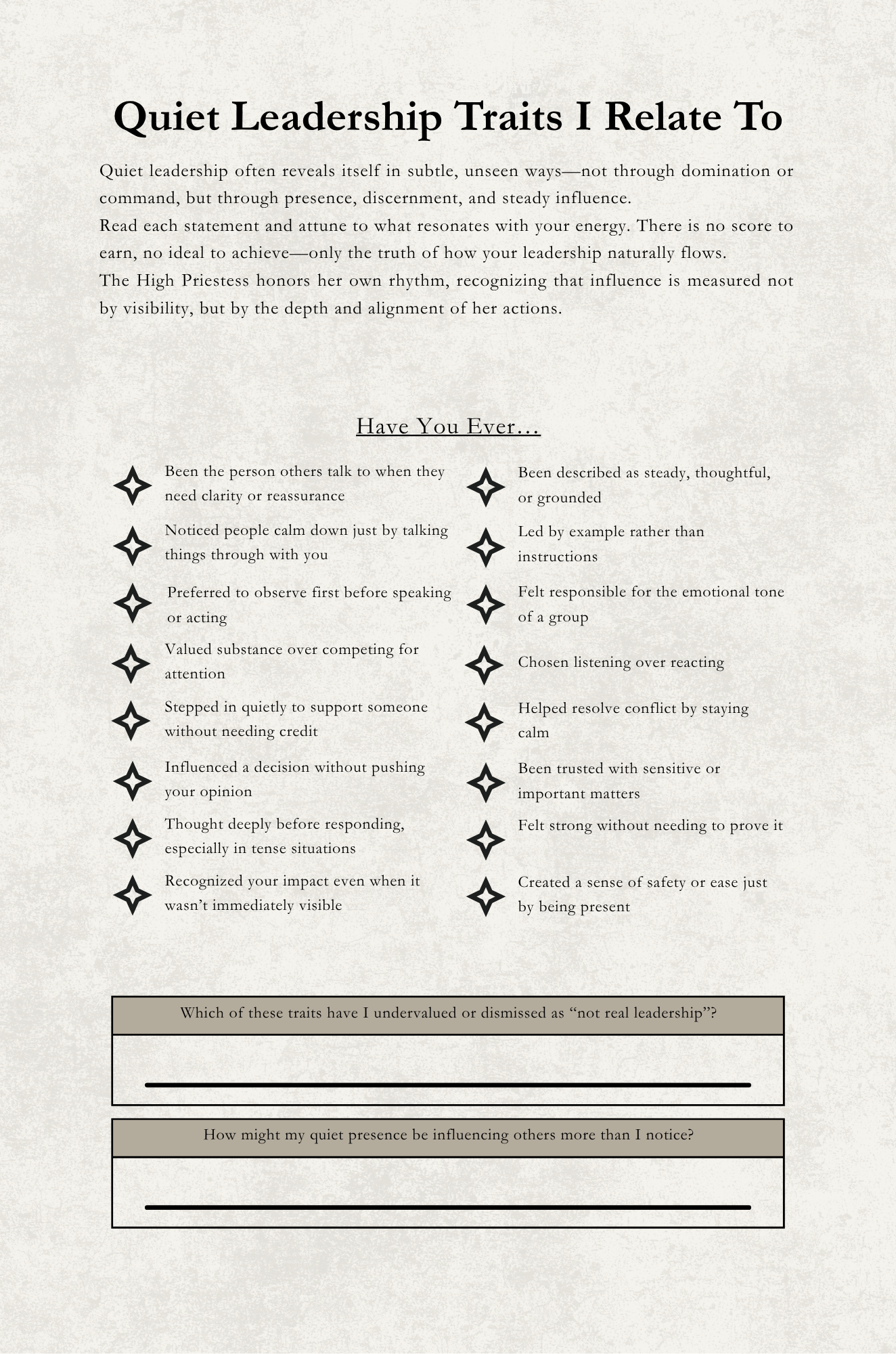 This workbook also supports you in releasing doubt, overthinking, and external validation so you can fully trust your inner guidance system. The High Priestess energy within you is already present—this workbook simply helps you remember and activate it.