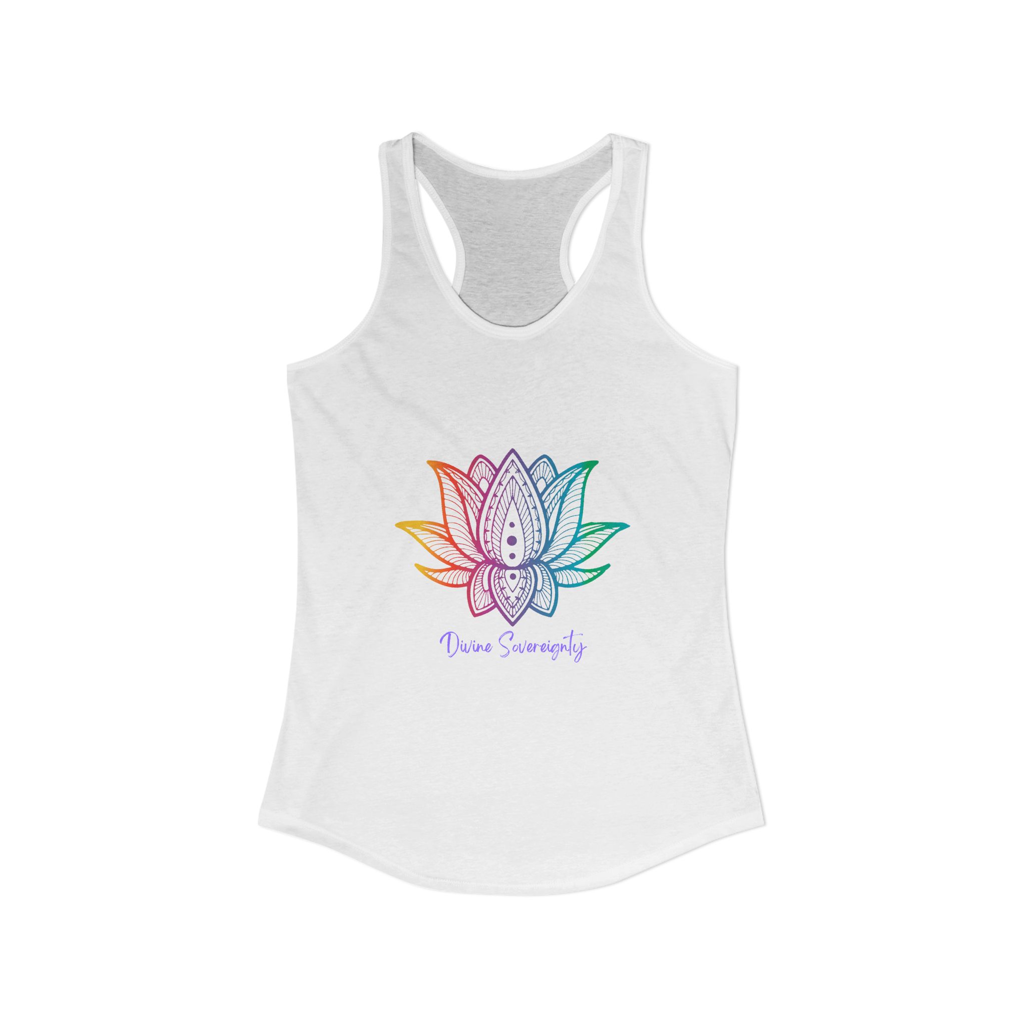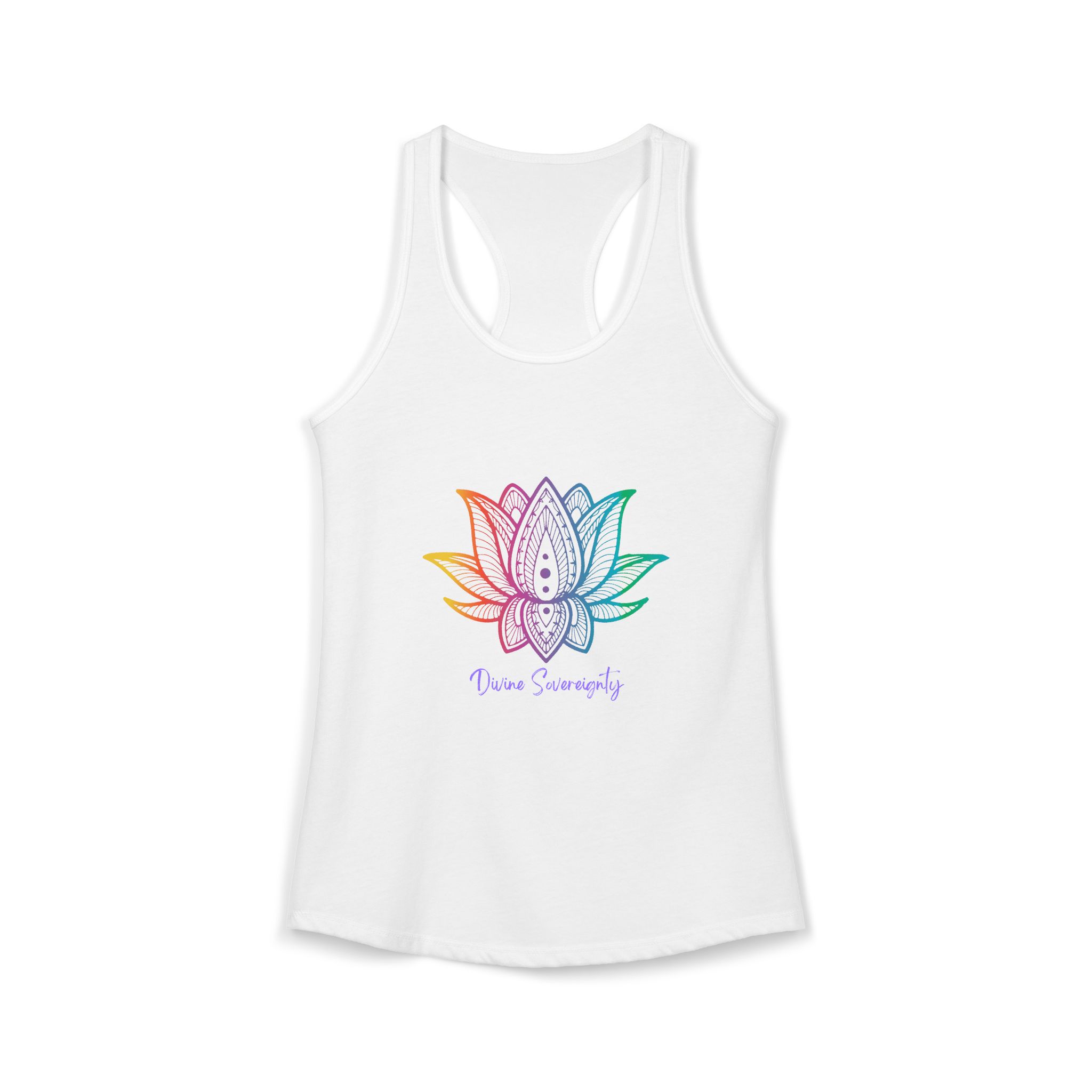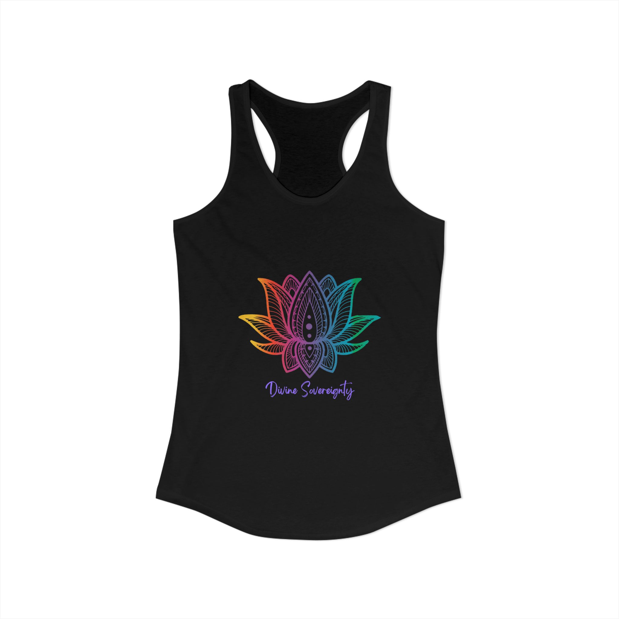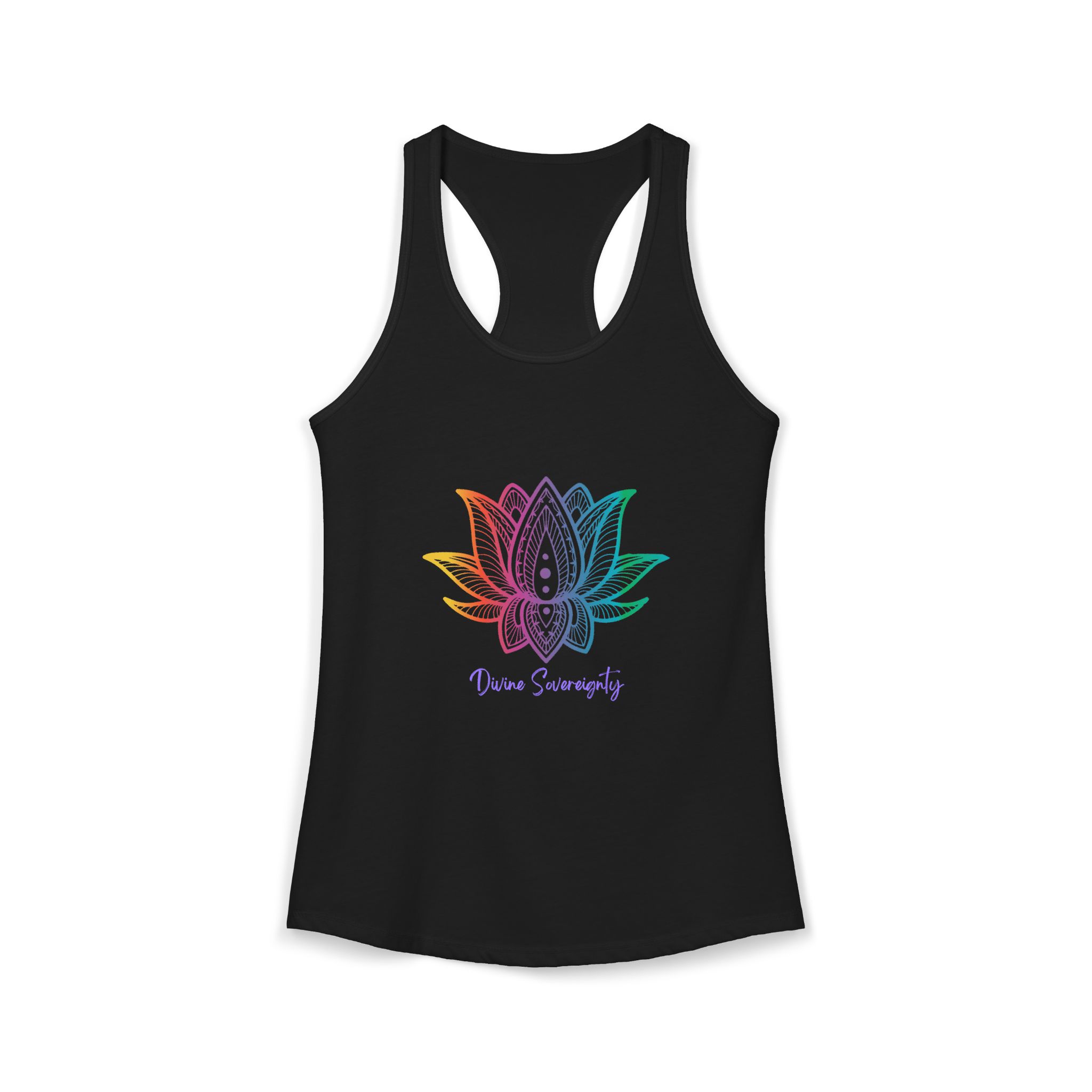 The Rainbow Lotus Racerback Tank is a vibrant celebration of spiritual growth, balance, and radiant energy. Crafted from soft, lightweight fabric with a flattering racerback design, this tank features a colorful lotus motif — symbolizing transformation, harmony, and the awakening of your highest self. Perfect for yoga, meditation, workouts, or casual wear, the phrase “Rainbow Lotus” reminds you to honor your journey, embrace your unique energy, and shine in alignment with your soul.