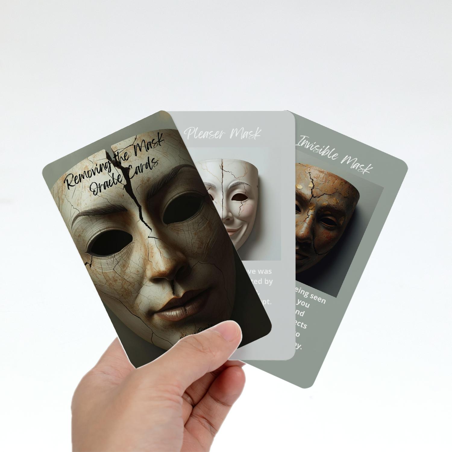 Removing the Mask Oracle Cards is a 64-card oracle deck designed as a transformative tool for deep self-discovery, shadow work, and authentic embodiment. It serves as a sacred mirror, guiding you through the many layers of identity, protective patterns, and subconscious conditioning that influence how you think, feel, and present yourself to the world.